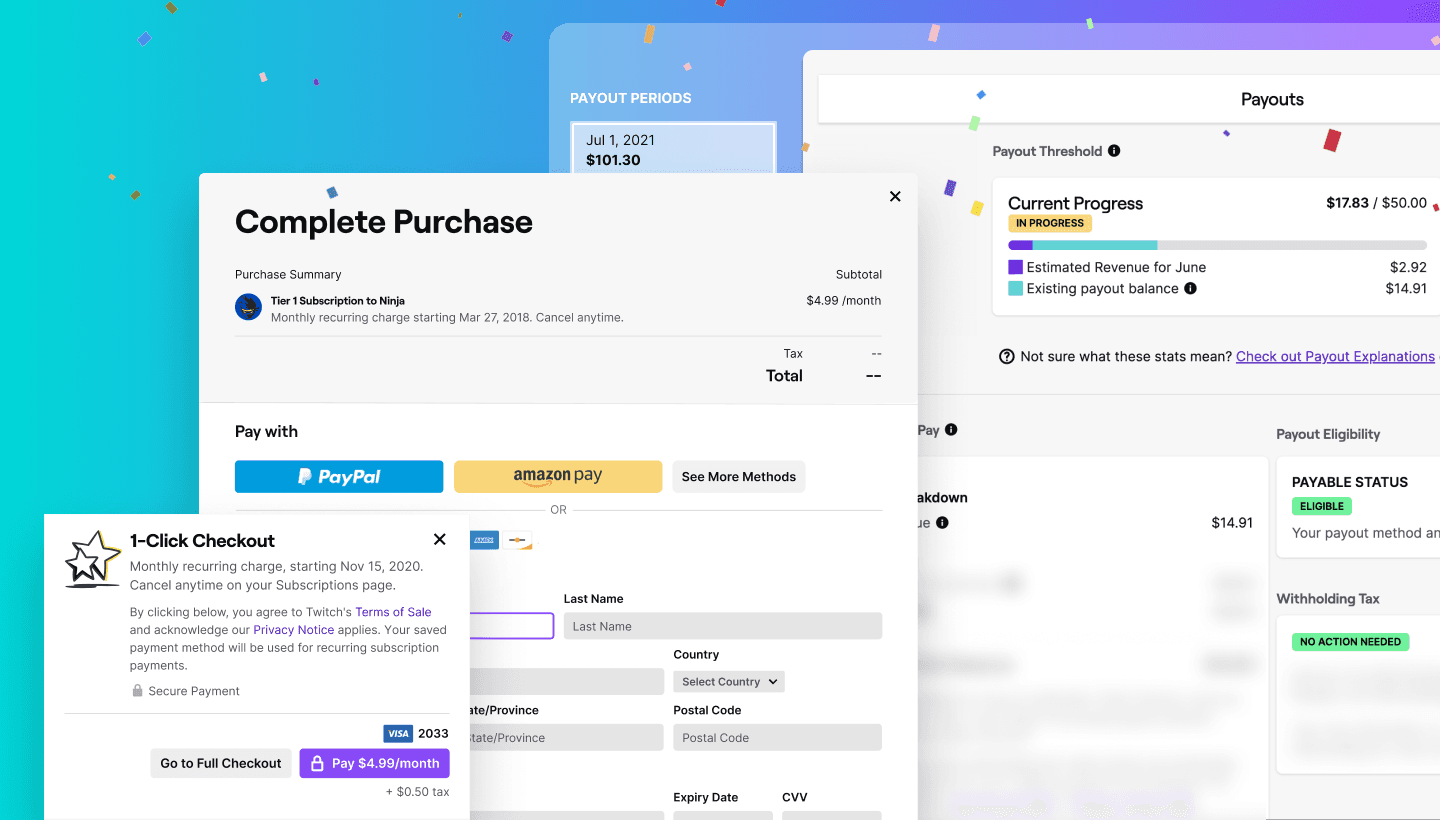 2020 - 2022 — As a Sr. UX Designer, I led design end-to-end on our money lifecycle. This included designing a unified Checkout that powers all of Twitch purchases today, a net-new payout dashboard, Subscription & Membership experiences that scale across Twitch's international user base and much more.